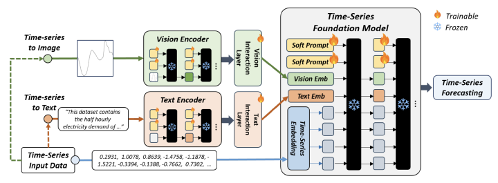 Time series forecasting is a foundational task across domains, such as finance, healthcare, and environmental monitoring. While recent advances in Time Series Foundation Models (TSFMs) have demonstrated strong generalisation through large-scale pretraining, existing models operate predominantly in a unimodal setting, ignoring the rich multimodal context, such as visual and textual signals, that often accompanies time series data in real-world scenarios. This paper introduces a novel parameter-efficient multimodal framework, UniCast, that extends TSFMs to jointly leverage time series, vision, and text modalities for enhanced forecasting performance. Our method integrates modality-specific embeddings from pretrained Vision and Text Encoders with a frozen TSFM via soft prompt tuning, enabling efficient adaptation with minimal parameter updates. This design not only preserves the generalisation strength of the foundation model but also enables effective cross-modal interaction. Extensive experiments across diverse time-series forecasting benchmarks demonstrate that UniCast consistently and significantly outperforms all existing TSFM baselines. The findings highlight the critical role of multimodal context in advancing the next generation of general-purpose time series forecasters.