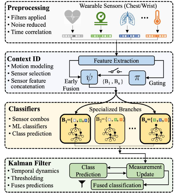 Wearable medical technology has become increasingly popular in recent years. One function of wearable health devices is stress detection, which relies on sensor inputs to determine a patient’s mental state. This continuous, real-time monitoring can provide healthcare professionals with vital physiological data and enhance the quality of patient care. Current methods of stress detection lack: 1) robustness—wearable health sensors contain high levels of measurement noise that degrades performance and 2) adaptation—static architectures fail to adapt to changing contexts in sensing conditions. We propose to address these deficiencies with SELF-CARE, a generalized selective sensor fusion method of stress detection that employs novel techniques of context identification and ensemble machine learning. SELF-CARE uses a learning-based classifier to process sensor features and model the environmental variations in sensing conditions known as the noise context. SELF-CARE uses noise context to selectively fuse different sensor combinations across an ensemble of models to perform robust stress classification. Our findings suggest that for wrist-worn devices, sensors that measure motion are most suitable to understand noise context, while for chest-worn devices, the most suitable sensors are those that detect muscle contraction. We demonstrate SELF-CARE’s state-of-the-art performance on the WESAD data set. Using wrist-based sensors, SELF-CARE achieves 86.34% and 94.12% accuracy for the 3-class and 2-class stress classification problems, respectively. For chest-based wearable sensors, SELF-CARE achieves 86.19% (3-class) and 93.68% (2-class) classification accuracy. This work demonstrates the benefits of utilizing selective, context-aware sensor fusion in mobile health sensing that can be applied broadly to Internet of Things applications.