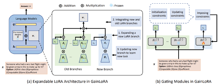 Continual learning (CL), which requires the model to learn multiple tasks sequentially, is crucial for large language models (LLMs). Recently, low-rank adaptation (LoRA), one of the most representative parameter-efficient fine-tuning (PEFT) methods, has gained increasing attention in CL of LLMs. However, most existing CL methods based on LoRA typically expand a new LoRA branch to learn each new task and force the new and old LoRA branches to influence old tasks equally, potentially leading to forgetting. In this work, we propose a new method, called gated integration of low-rank adaptation (GainLoRA), for CL of LLMs. GainLoRA expands a new LoRA branch for each new task and introduces gating modules to integrate the new and old LoRA branches. Furthermore, GainLoRA leverages the new gating module to minimize the influence from the new LoRA branch to old tasks, effectively mitigating forgetting and improving the model’s overall performance. Experimental results on CL benchmarks demonstrate that GainLoRA outperforms existing state-of-the-art methods