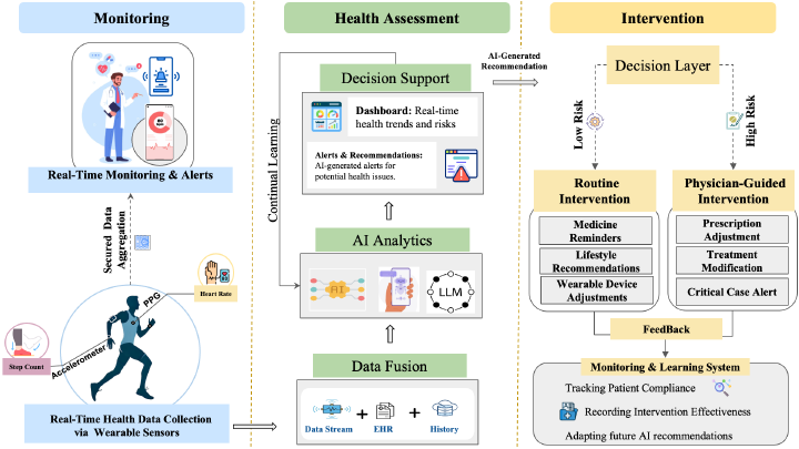 AI-powered wearable sensors are transforming remote health monitoring by enabling real-time diagnostics, personalized interventions and proactive disease management. This review synthesizes recent advances in AI-integrated biosensors across conditions such as diabetes, cardiovascular disease, neurodegenerative dis- orders, mental health, and maternal/neonatal care, while addressing challenges of scalability, privacy, interoperability, and model robustness. We highlight machine learning methods—including federated learning, transfer learning, and edge- AI—that enhance the processing of physiological signals i.e., glucose levels, gait patterns, and heart rate variability. Key innovations, including FDA-approved glucose monitors and digital twins for predictive health modeling, underscore the shift toward patient-centric and data-driven care. Yet, persistent gaps remain, including device heterogeneity, privacy concerns, and the need for adaptive models that generalize across populations. Emerging approaches such as large language models and counterfactual explanations provide contextualized insights and transparent decision-making. By bridging technical advances with clinical needs, this review charts a roadmap toward democratized, equitable, and precise healthcare.